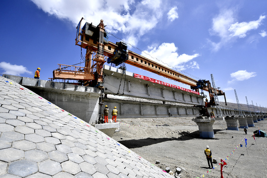 圖為中鐵二十二局集團(tuán)施工人員在格庫鐵路茫崖湖2號特大橋上架設(shè)T梁。記者 張龍 攝