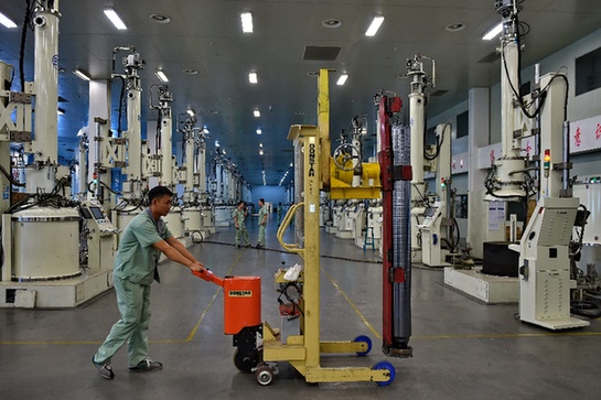 潞安集團(tuán)太陽(yáng)能科技有限責(zé)任公司的單晶拉制工人在搬運(yùn)剛剛生產(chǎn)的單晶硅棒。記者 曹陽(yáng) 攝
