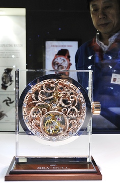 海鷗表陀飛輪機(jī)芯5:1大小的模型。記者 岳月偉 攝