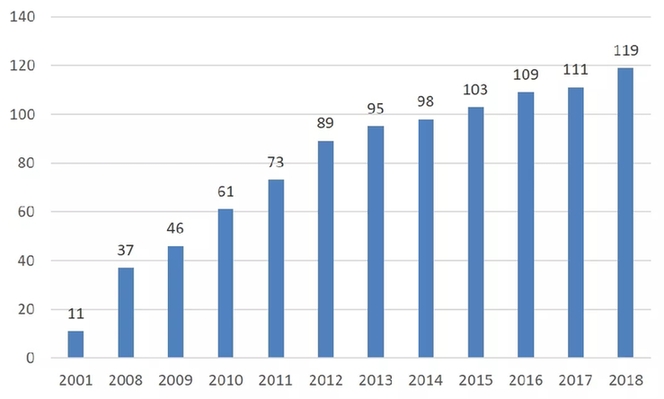 表1:2001年以來進入《財富》世界500強的中國大陸(包括香港)企業(yè)數量。資料來源:根據《財富》雜志歷年數據整理。進入《財富》世界500強榜單的中國大陸企業(yè)(包含香港地區(qū)企業(yè))。