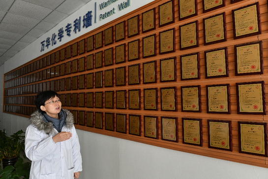 在煙臺萬華化學(xué)集團中央研究院先進表面材料中心,萬華員工在專利墻前介紹萬華取得的科技創(chuàng)新成就。資料照片