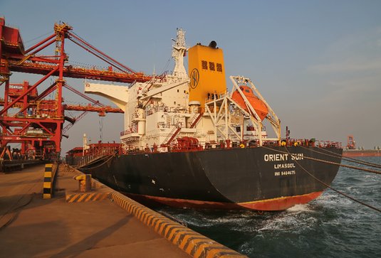 一艘輪船靠泊在秦皇島港礦石碼頭卸載。記者 楊世堯 攝