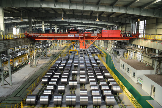 無(wú)人吊車(chē)在包鋼集團(tuán)稀土鋼板材廠(chǎng)冷軋軋后庫(kù)夾取鋼卷。新華社發(fā)(李志鵬 攝)