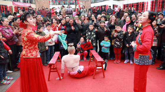 近年來(lái),瀘州市江陽(yáng)區(qū)為大力弘揚(yáng)社會(huì)主義核心價(jià)值觀(guān),鞏固全國(guó)文明城市成果,不斷豐富社區(qū)黨員群眾的精神文化生活。圖為在江陽(yáng)區(qū)張壩景區(qū)開(kāi)展“三下鄉(xiāng)”文藝活動(dòng)。