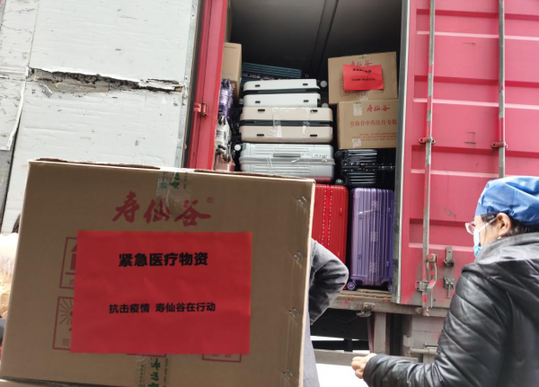 圖片說明:壽仙谷捐贈的靈芝孢子粉被裝上第二批浙江赴武漢醫(yī)療隊行李與物資車