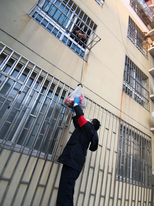 黨員干部給隔離居民吊送日用品