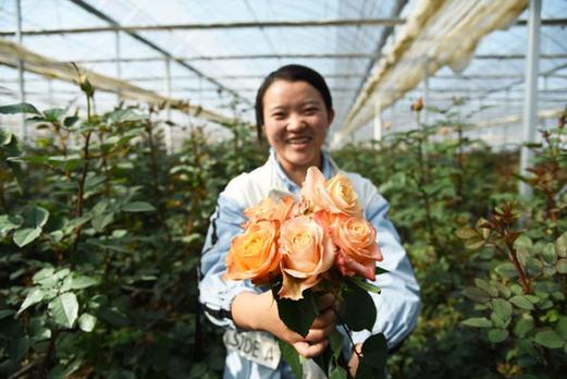 莒縣招賢鎮(zhèn)現(xiàn)代化玫瑰產(chǎn)業(yè)園園區(qū)負(fù)責(zé)人張艷嬌展示剛剛采摘的玫瑰鮮切花。記者 王凱 攝
