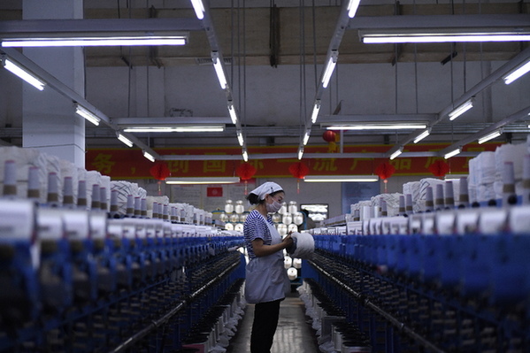 在吉林化纖集團(tuán)股份公司的長絲車間,工人們正在生產(chǎn)線上工作。(資料照片)
