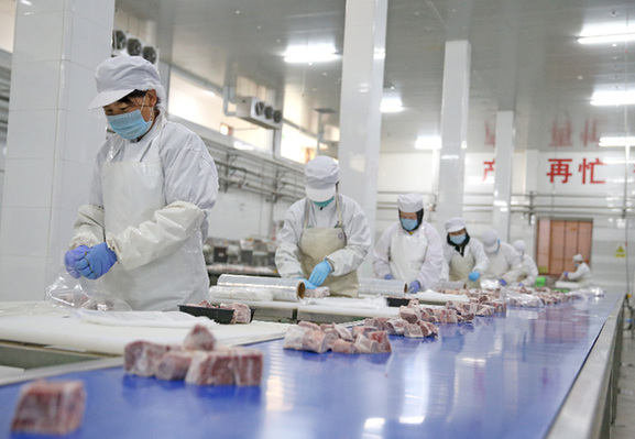 工人在寧夏鹽池灘羊產(chǎn)業(yè)發(fā)展集團(tuán)生產(chǎn)車(chē)間內(nèi)加工灘羊肉。記者 賈浩成 攝