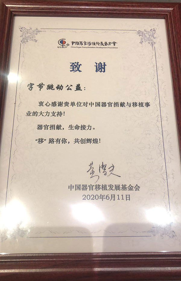 中國器官移植發(fā)展基金會為本次活動中支持中國器官捐獻與移植事業(yè)的公益支持方頒發(fā)感謝狀。(圖片來源:中國器官移植發(fā)展基金會)