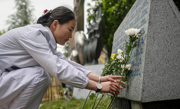2019年4月3日,醫(yī)務(wù)工作者代表在活動(dòng)現(xiàn)場(chǎng)向捐獻(xiàn)者紀(jì)念碑獻(xiàn)花。 新華社記者江文耀攝