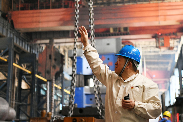 在中國一重生產(chǎn)車間,工人在進(jìn)行生產(chǎn)作業(yè)。記者王建威 攝