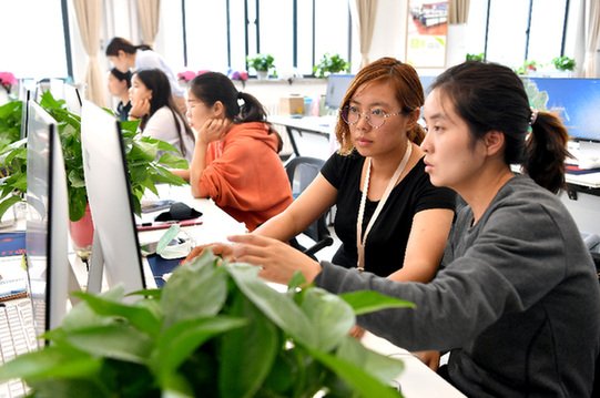 圖為客服人員在楊凌示范區(qū)的一家農(nóng)產(chǎn)品電商公司內(nèi)工作。