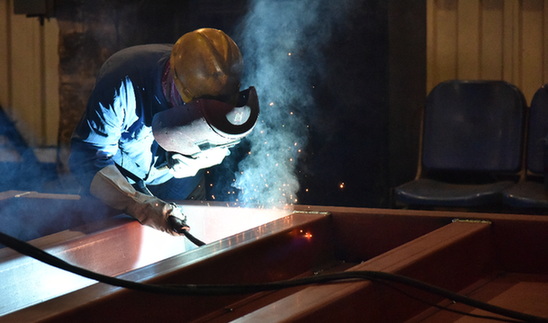 工人在中車齊車公司廠房內(nèi)焊接C70E型貨車。新華社發(fā)(唐鐵富 攝)