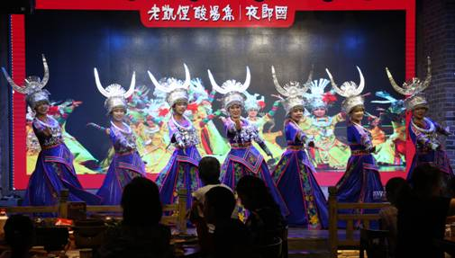 隨著鄒遠(yuǎn)與丁文建走進(jìn)大廳,一場苗族歌舞表演《盛世銀裝》正在上演,藍(lán)色的裙擺蕩出陣陣?yán)嘶ǎ赖你y飾秀出眩目光影,苗姑娘們用輕快曼妙的舞姿伴隨著銀鈴發(fā)出的聲音,展示著苗嶺的幸福與歡樂。整場演出將貴州獨(dú)有的苗族文化、服飾特色、歌舞風(fēng)情等原生態(tài)民俗民風(fēng)淋漓盡致地展現(xiàn)在了觀眾面前。
