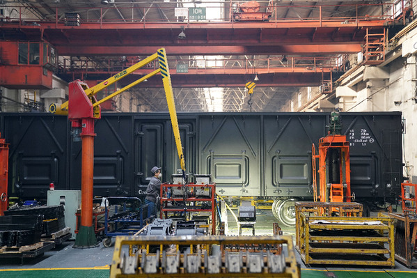 中車齊車、中國(guó)一重所在地齊齊哈爾市,上半年GDP同比增長(zhǎng)0.7%,在黑龍江省排名第一,同比全國(guó)、全省高出2.3%、5.6%。圖為中車齊車公司生產(chǎn)車間,工人在生產(chǎn)作業(yè)。
