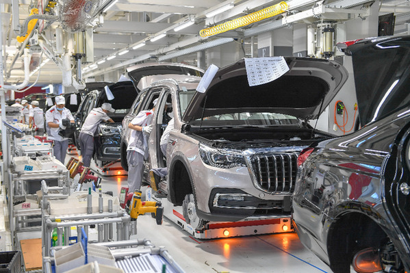 在位于長(zhǎng)春的一汽紅旗總裝車間,工人裝配車輛。