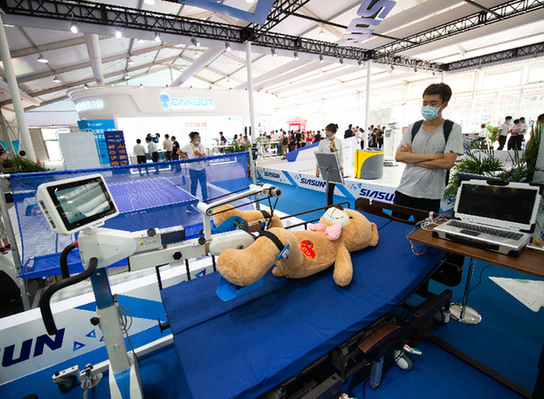 9月5日,觀眾在服貿(mào)會(huì)新松機(jī)器人展區(qū)觀看上下肢主被動(dòng)康復(fù)訓(xùn)練系統(tǒng)演示。