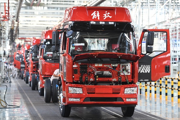 在位于長春的一汽解放總裝車間,車輛在生產(chǎn)線上等待裝配。中國一汽前三季度銷售整車超265萬輛,同比增長8%。記者 張楠 攝
