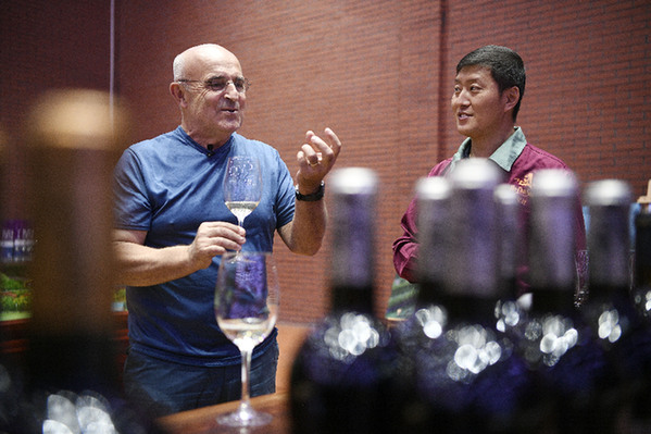 來自法國的釀酒師瑞吉(左)在寧夏銀川市永寧縣寧夏賀蘭神國際葡萄酒莊酒窖里與當(dāng)?shù)蒯劸茙熞煌穱L葡萄酒。記者 王鵬 攝