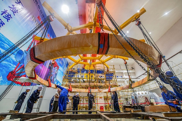 中核集團(tuán)核工業(yè)西南物理研究院的工作人員在安裝調(diào)試中國環(huán)流器二號(hào)M裝置時(shí)起吊線圈。新華社發(fā)