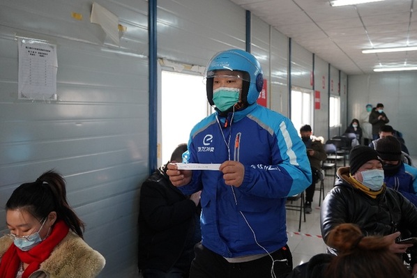 今年35歲的張衛(wèi)鵬是餓了么平臺的一名外賣騎手,和他一起接種的還有幾十位同樣留在北京過春節(jié)的騎手同事。