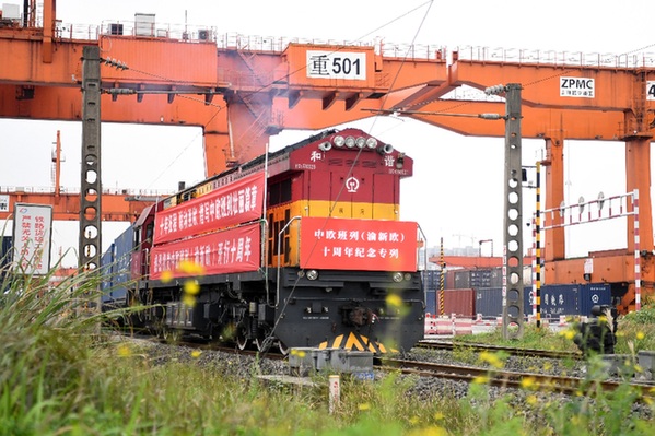 10年后的3月19日,也是在重慶團(tuán)結(jié)村中心站,中歐班列迎來(lái)“10歲生日”。一列印有“中歐班列(渝新歐)10周年紀(jì)念專列”字樣的班列緩緩駛出站臺(tái),駛向一萬(wàn)多公里外的德國(guó)杜伊斯堡。