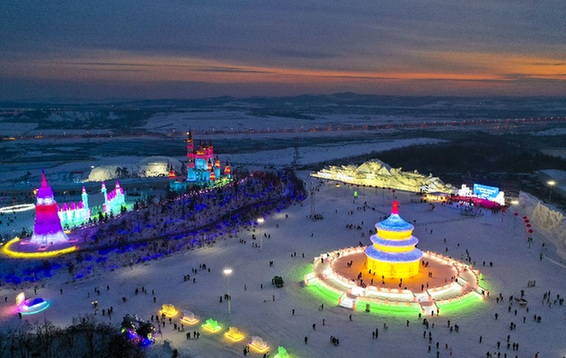 無人機(jī)拍攝的長(zhǎng)春冰雪新天地主題冰雪樂園。記者 許暢 攝