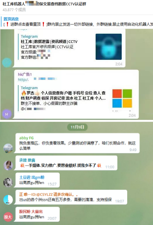 近期,記者在Telegram上一個名為“社工機器人&閑魚擔(dān)保交易查檔數(shù)據(jù)某認(rèn)證群”的社交群上看到,大量的包括戶籍、手機號、定位、查人查檔、財產(chǎn)調(diào)查、開房記錄、流水等在內(nèi)的用戶信息被公開售賣,十分猖獗。