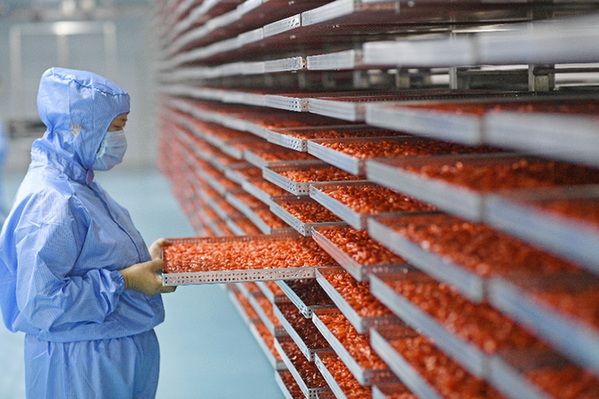 ????去年,寧夏將枸杞產(chǎn)業(yè)列入全區(qū)九大重點產(chǎn)業(yè)之一,現(xiàn)階段寧夏從事枸杞深加工的企業(yè)有240余家,枸杞鮮果加工轉(zhuǎn)化率達(dá)到25%。干果、酒類、功能性食品和中藥飲片等枸杞及其衍生制品達(dá)10大類60余種,12款特膳食品、4款保健產(chǎn)品批量生產(chǎn),枸杞原漿產(chǎn)能達(dá)到1萬噸以上,枸杞糖肽、護(hù)肝片等功能性食品已進(jìn)入醫(yī)院營養(yǎng)配餐渠道。