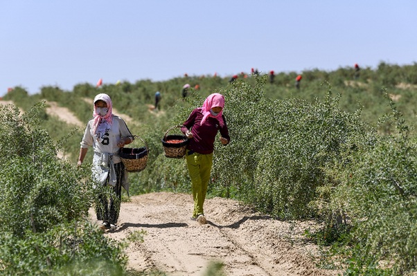 ????“中國枸杞看寧夏,寧夏枸杞看中寧”。在寧夏中衛(wèi)市中寧縣,一片片枸杞地里,包著頭巾的女工正彎腰采摘枸杞。一行行綠油油的枸杞樹下,掛滿鮮紅欲滴的枸杞果實。