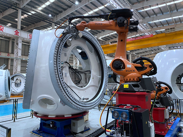 浙江省機(jī)電集團(tuán)所屬運(yùn)達(dá)風(fēng)電裝配車間里,機(jī)器人正在進(jìn)行緊固變槳軸承螺栓作業(yè)。資料照片