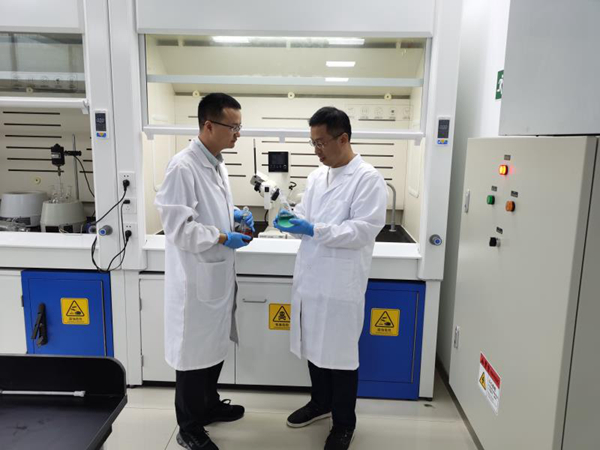 博創(chuàng)宏遠(yuǎn)新材料有限公司負(fù)責(zé)人趙杰博士(右)正在做鋰電正極材料研發(fā)實驗。(資料照片)