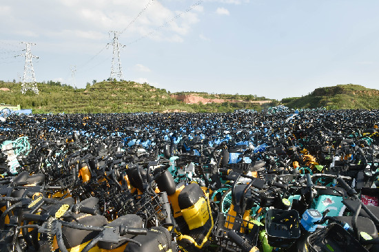 這是位于山西省太原市楊家峪村附近的一處共享電單車回收倉(cāng)庫(kù)(8月4日攝)。