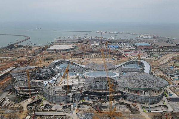 目前,海口國(guó)際免稅城免稅商業(yè)中心正在進(jìn)行屋面網(wǎng)架、外立面幕墻及室內(nèi)精裝等作業(yè)。??趪?guó)際免稅城項(xiàng)目建成后,將成為??谛碌貥?biāo)、國(guó)際旅游消費(fèi)中心的新名片。