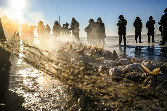 晨曦微露,白茫茫的查干湖面鋪上一層暖色,漁民們齊聲喊著號(hào)子,用“冰镩子”打出冰窟,將長(zhǎng)桿沿著冰窟把漁網(wǎng)送進(jìn)水里。七八個(gè)小時(shí)后,清脆的揚(yáng)鞭聲中,八匹馬喘著粗氣拉動(dòng)絞盤,漁網(wǎng)一寸寸從冰窟里浮出水面,數(shù)萬(wàn)斤魚(yú)在氤氳的水氣中連蹦帶跳地被拉上冰面。游客沸騰了,拍照、選魚(yú)、直播……兩個(gè)小朋友抬起一條30斤的胖頭魚(yú),快樂(lè)歡呼。