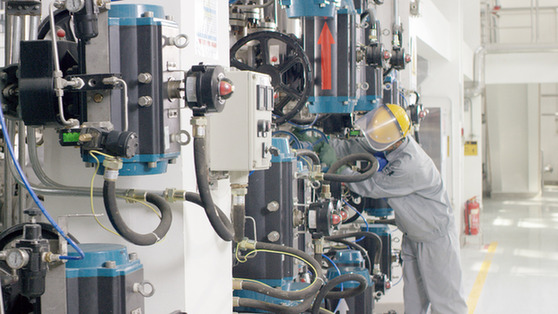 中國節(jié)能集團(tuán)萬潤公司工人在生產(chǎn)車間作業(yè)。資料照片