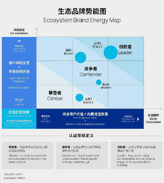 2021年,凱度、牛津大學(xué)賽德商學(xué)院、《哈佛商業(yè)評(píng)論》中文版一起合作,共同制定并全球首發(fā)「生態(tài)品牌認(rèn)證體系」,從「共同進(jìn)化」、「價(jià)值循環(huán)」和「品牌理想」三大視角及其下屬的五個(gè)核心維度(用戶體驗(yàn)交互、開放協(xié)同共創(chuàng)、終身用戶價(jià)值、共贏增值效用、社會(huì)價(jià)值貢獻(xiàn))和16項(xiàng)評(píng)估細(xì)則出發(fā),評(píng)估品牌在生態(tài)品牌轉(zhuǎn)型與打造過(guò)程中的成效和進(jìn)化階段。