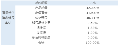 報告顯示,直播帶貨消費(fèi)維權(quán)輿情反映的主要問題中,涉及產(chǎn)品質(zhì)量問題的占32.35%,虛假宣傳的占31.64%,價格誤導(dǎo)的占30.21%,誘導(dǎo)場外交易的占2.69%,退換貨的占1.83%,發(fā)貨慢的占1.20%,銷售違禁商品的占0.09%。其中,產(chǎn)品質(zhì)量、虛假宣傳、價格誤導(dǎo)等直播帶貨問題最為突出。