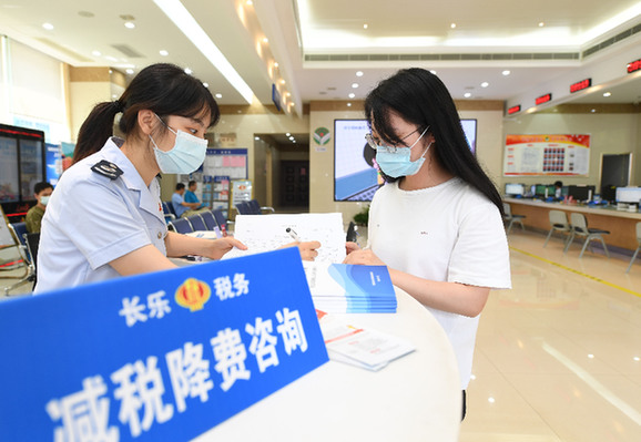 2020年8月19日,在國家稅務(wù)總局福州市長樂區(qū)稅務(wù)局辦稅大廳,工作人員在輔導(dǎo)企業(yè)人員辦理減稅降費(fèi)業(yè)務(wù)。新華社記者 宋為偉 攝
