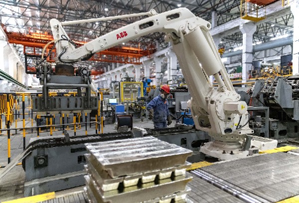 工人在云南錫業(yè)集團(控股)有限責任公司錫錠生產(chǎn)車間流水線上工作。新華社記者 陳欣波 攝