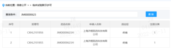 JMKX000623是上海濟(jì)煜自主研發(fā)的高選擇性離子通道阻滯劑,擁有自主知識(shí)產(chǎn)權(quán),屬化學(xué)藥品1類,臨床試驗(yàn)申請(qǐng)于2021年12月30日獲得CDE受理,僅2個(gè)月零10天即獲得臨床試驗(yàn)?zāi)驹S可。JMKX000623通過(guò)阻滯鈉離子內(nèi)流而阻止痛覺(jué)發(fā)生和傳遞,有望為各種疼痛患者提供治療上的有效緩解。