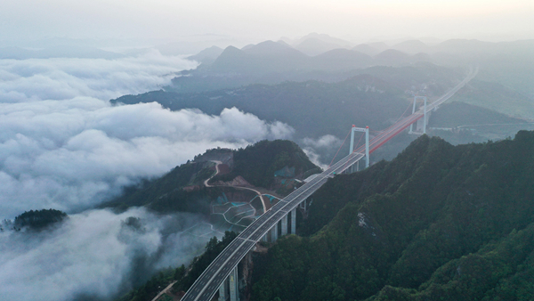 3月28日拍攝的晨霧中的貴黃高速公路陽寶山特大橋和石頭寨特大橋(無人機(jī)照片)。