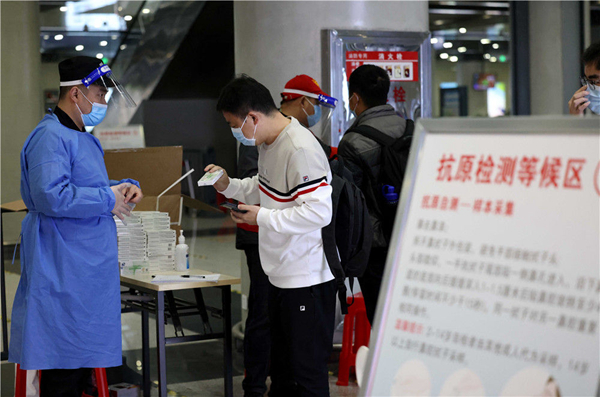 3月27日,在合肥火車站出站大廳,出站旅客領取免費發(fā)放的抗原檢測試劑。新華社發(fā)(解琛 攝)