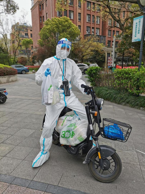 圖為上海市奉賢區(qū)奉浦街道秋月居委奧克苑小區(qū)居民配送員為居民送菜送藥