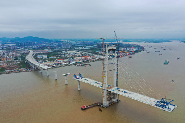 正在進行箱梁架設的深中通道中山大橋建設現(xiàn)場(5月15日攝,無人機照片)。