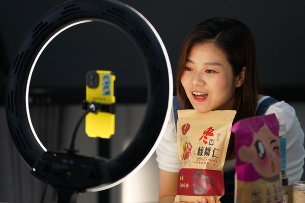 5月12日,殘疾人網(wǎng)絡(luò)主播渭梅女在西安一家直播產(chǎn)業(yè)基地直播帶貨。