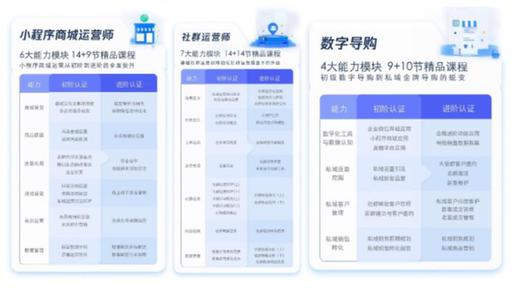 其中,小程序商城運營師將圍繞商城、商品、活動、會員、數據等維度開展能力進階培訓;社群運營師將從場景、數據、流量、工具等層面助力培養(yǎng)精細化社群運營操盤手;數字導購則圍繞微信生態(tài)工具的使用、流量挖掘、客戶管理及轉化打造金牌導購。據悉,目前首批內測學員名額已開放。