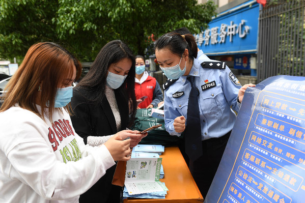 5月16日,貴州省貴陽市云巖區(qū)八鴿巖街道干部和民警為群眾講解防范電信詐騙知識(shí)。5月17日世界電信日到來之際,各地開展多種活動(dòng),迎接世界電信日。