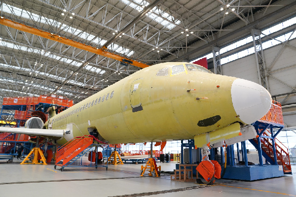 ▲中國商飛上海飛機(jī)制造有限公司總裝車間內(nèi)的國產(chǎn)ARJ21飛機(jī)。記者 丁汀 攝